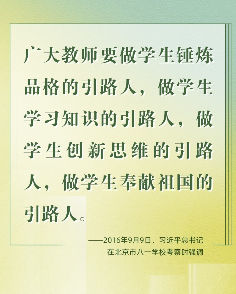 他們帶領(lǐng)學(xué)生前行,更新舊知、開掘新知、探索未知;他們肩負(fù)光榮使命,為黨育人、為國育才、為民育未來。守教育報國初心、擔(dān)立德樹人使命、圓民族復(fù)興之夢,建設(shè)社會主義現(xiàn)代化強國之路上,教育家精神自當(dāng)念茲在茲、代代傳承、光芒永綻。