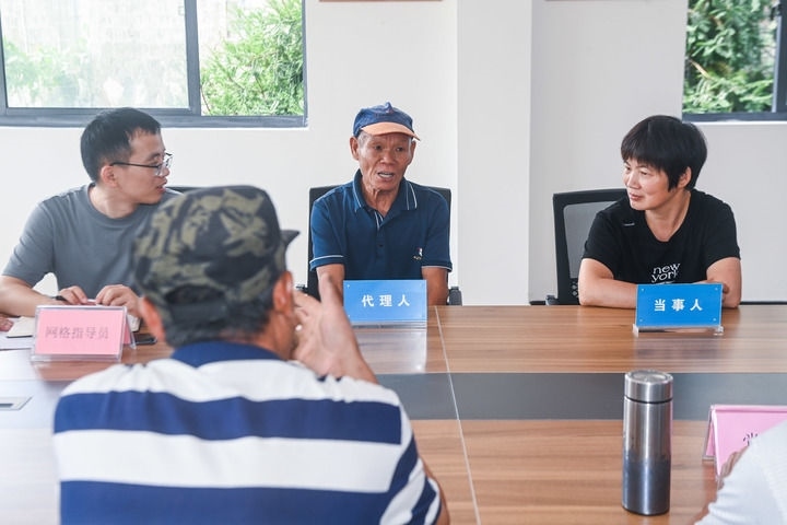 2023年7月26日,在浙江省諸暨市東白湖鎮(zhèn)婁東村新時代文明實踐站的文明共富會客廳內(nèi),網(wǎng)格長召集村里矛盾雙方當事人以及黨員代表、鄉(xiāng)賢代表、人大代表等成員進行宅基地指標糾紛的現(xiàn)場調(diào)解。新華社記者 徐昱 攝