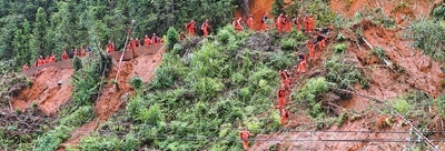 湖南省郴州市資興市八面山瑤族鄉(xiāng),消防救援人員穿越山體滑坡路段,徒步前往受災地區(qū)。李 科攝(人民視覺)