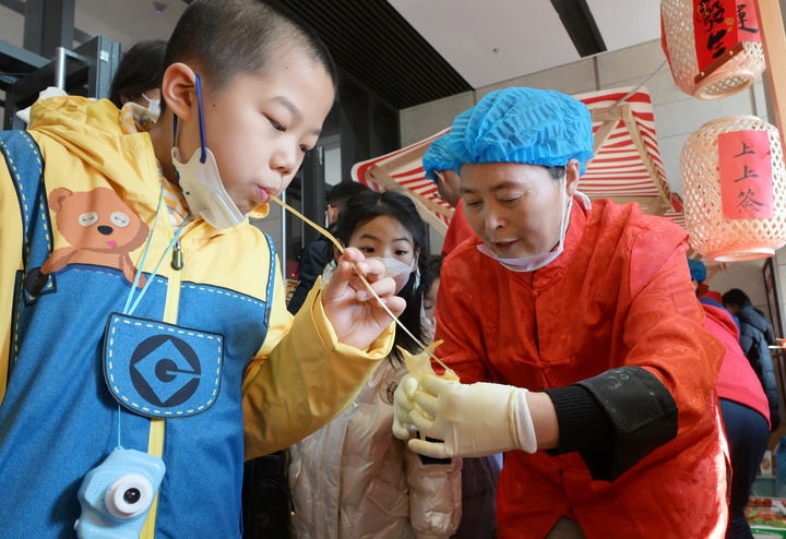 2025年1月29日,小朋友在位于北京的中國非物質文化遺產館舉行的“過年——春節(jié)主題展”上體驗“吹糖人”。新華社記者 李賀 攝