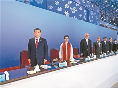 19時(shí)58分,在《和平——命運(yùn)共同體》的樂曲聲中,習(xí)近平和夫人彭麗媛,同國際奧委會(huì)主席巴赫、亞奧理事會(huì)第一副主席霍震霆等步入主席臺(tái),向觀眾揮手致意。全場(chǎng)響起長時(shí)間的熱烈掌聲。