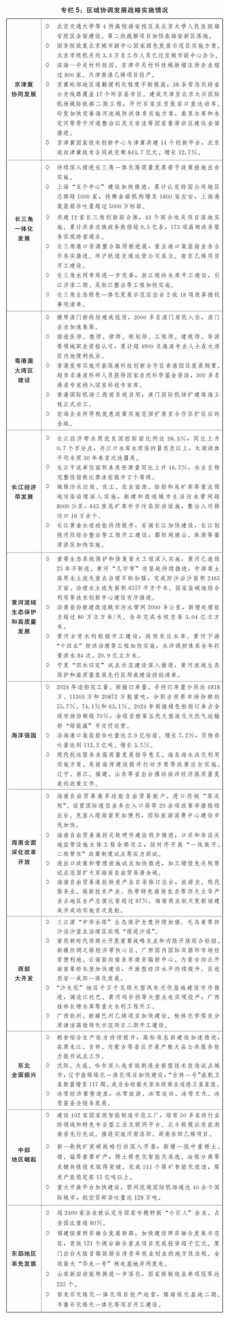 一是區(qū)域協(xié)調(diào)發(fā)展積厚成勢(shì)。京津冀協(xié)同發(fā)展走深走實(shí),在京相關(guān)高校、醫(yī)院、中央企業(yè)總部及二三級(jí)子公司分批向雄安新區(qū)疏解,北京城市副中心行政辦公、商務(wù)服務(wù)、文化旅游等功能不斷完善,進(jìn)一步支持天津?yàn)I海新區(qū)高質(zhì)量發(fā)展若干政策措施出臺(tái)實(shí)施,三省市互聯(lián)互通交通網(wǎng)絡(luò)更加完善、產(chǎn)業(yè)鏈上下游協(xié)作持續(xù)強(qiáng)化、公共服務(wù)共建共享水平進(jìn)一步提升。長(zhǎng)三角一體化高質(zhì)量發(fā)展深入推進(jìn),生態(tài)綠色一體化發(fā)展示范區(qū)改革授權(quán)壓茬推進(jìn),港口資源整合、軌道互聯(lián)互通等取得新進(jìn)展,上海“五個(gè)中心”建設(shè)進(jìn)一步加快?;浉郯拇鬄硡^(qū)建設(shè)邁上新臺(tái)階,橫琴粵澳深度合作區(qū)封關(guān)“一線”“二線”分線管理運(yùn)行順利,超1.6萬(wàn)名澳門(mén)居民在合作區(qū)居住生活,支持河套深港科技創(chuàng)新合作區(qū)深圳園區(qū)、香港園區(qū)聯(lián)動(dòng)發(fā)展,創(chuàng)新要素跨境流動(dòng)更加便捷。長(zhǎng)江經(jīng)濟(jì)帶共抓大保護(hù)、不搞大開(kāi)發(fā)成效顯著,進(jìn)一步抓實(shí)抓好長(zhǎng)江大保護(hù)工作三年行動(dòng)計(jì)劃出臺(tái)實(shí)施,長(zhǎng)江十年禁漁取得明顯成效,長(zhǎng)江干流連續(xù)5年保持Ⅱ類(lèi)水質(zhì),綜合立體交通走廊加快構(gòu)建,沿江高鐵全線開(kāi)工建設(shè)。黃河流域生態(tài)保護(hù)和高質(zhì)量發(fā)展邁出堅(jiān)實(shí)步伐,農(nóng)業(yè)面源、城鎮(zhèn)生活、工業(yè)和尾礦庫(kù)污染治理深入推進(jìn),8萬(wàn)余個(gè)入河排污口開(kāi)展溯源整治,一批生態(tài)保護(hù)修復(fù)重點(diǎn)項(xiàng)目加快建設(shè),黃河干流連續(xù)3年保持Ⅱ類(lèi)水質(zhì)。海洋強(qiáng)國(guó)建設(shè)深入推進(jìn),海洋強(qiáng)省、現(xiàn)代海洋城市、全國(guó)海洋經(jīng)濟(jì)發(fā)展示范區(qū)創(chuàng)新發(fā)展,海洋生態(tài)環(huán)境質(zhì)量持續(xù)改善,海洋生產(chǎn)總值超10萬(wàn)億元。