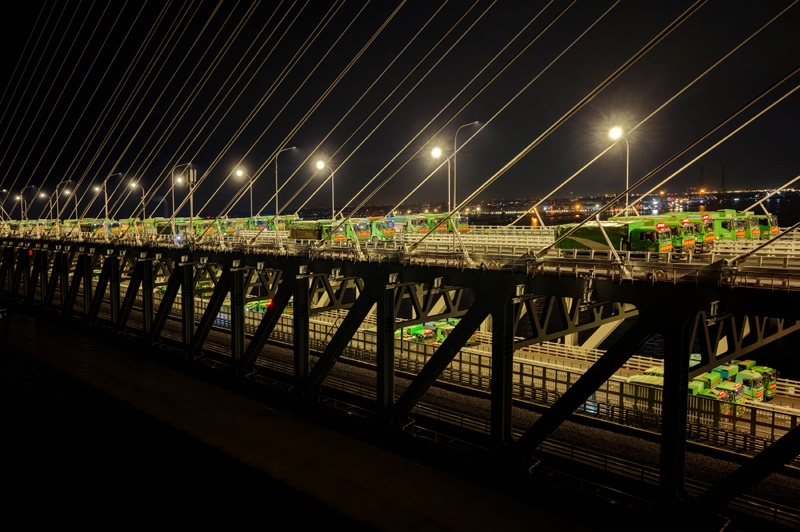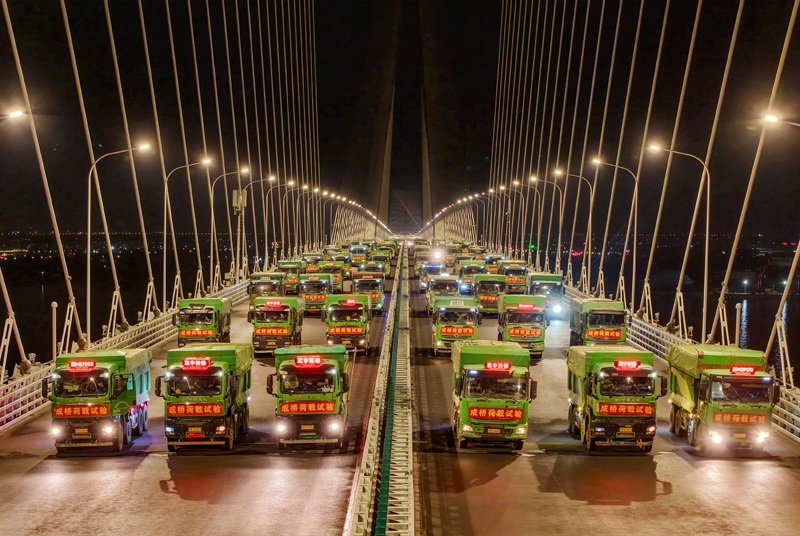 6月20日晚,常泰長江大橋主航道橋進行4400噸荷載試驗,110輛重型卡車駛上主航道橋面,啟動靜態(tài)荷載試驗。自6月16日起,常泰長江大橋開啟為期一周的荷載試驗,對大橋承載力和安全性進行全面評估。
