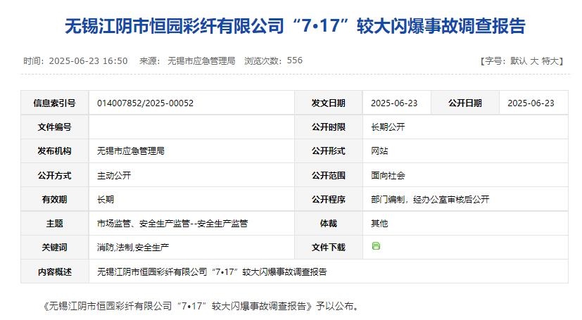 調(diào)查認(rèn)定,無錫江陰市恒園彩纖有限公司“7·17”較大閃爆事故是一起因崗位員工盲目操作,生產(chǎn)單元安全設(shè)施缺失,現(xiàn)場應(yīng)急處置不當(dāng),地方黨委、政府及其有關(guān)部門履職不到位而導(dǎo)致的較大生產(chǎn)安全責(zé)任事故。
