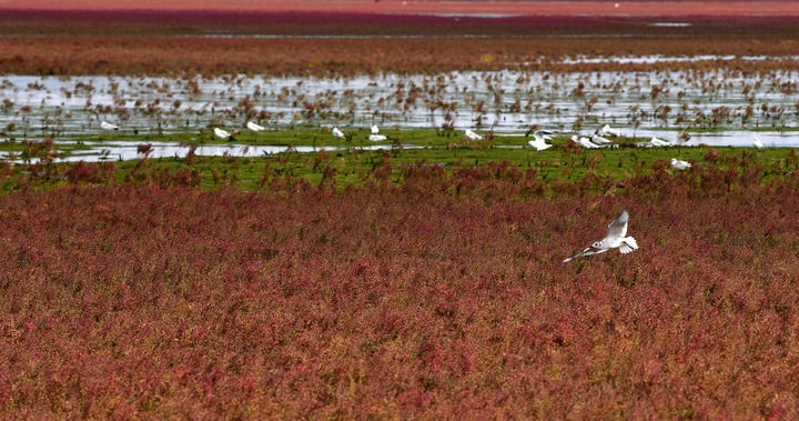 2024年9月14日,海鳥在遼寧省錦州市凌海市紅海灘國(guó)家風(fēng)景廊道紅海灘上空飛翔。新華社記者 錢一 攝