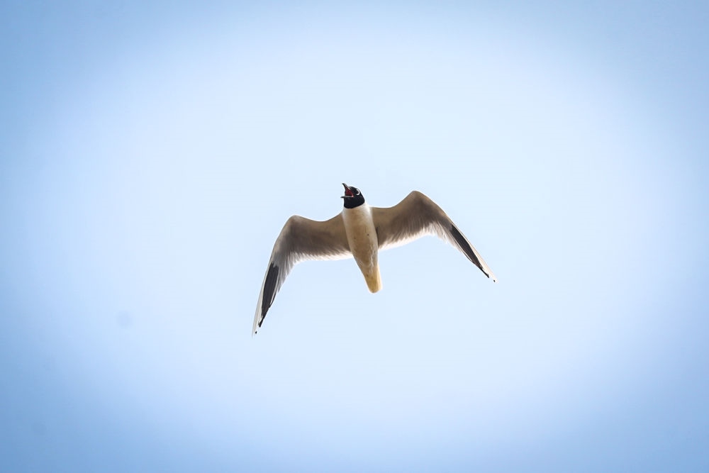 在盤錦市遼河口國(guó)家級(jí)自然保護(hù)區(qū)南小河保護(hù)站附近的濕地,黑嘴鷗在天空中飛翔(2022年6月17日攝)。新華社記者 潘昱龍 攝