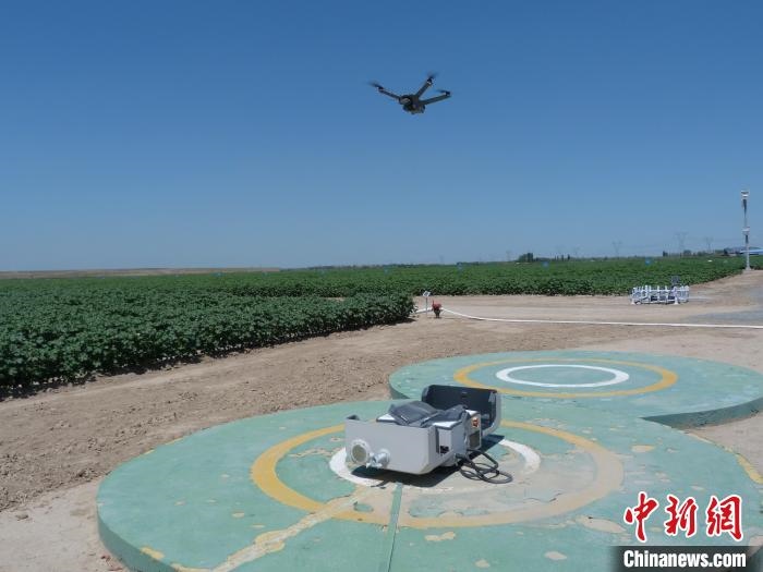 6月28日,新疆石河子市一片棉田中,遙感監(jiān)測作物長勢的無人機巡檢返回。 趙婧姝 攝