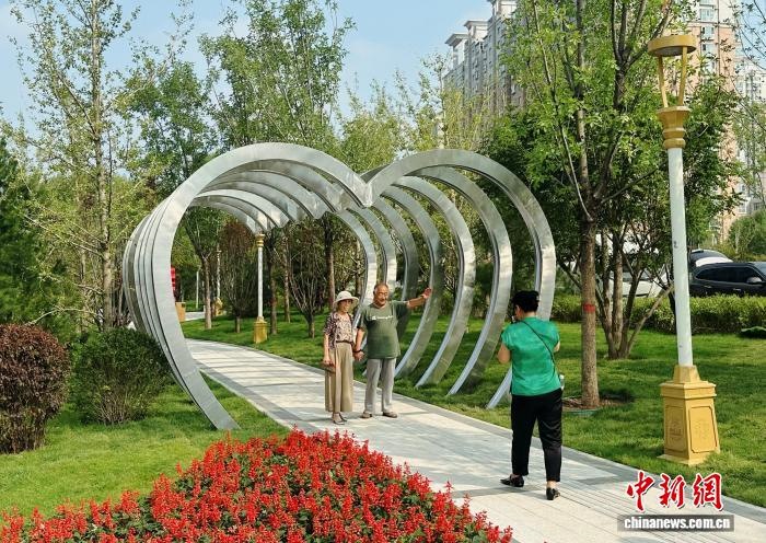 9月12日,民眾在山西省太原市迎澤大街月老廣場(chǎng)心形廊架下合影留念。 中新社記者 李庭耀 攝