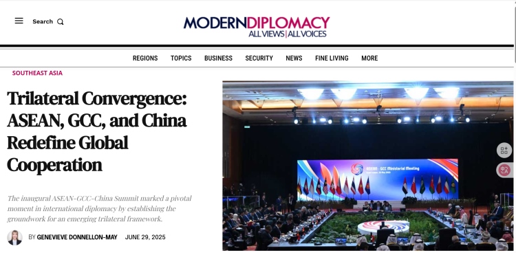 6月29日,歐洲《現(xiàn)代外交》網(wǎng)站刊發(fā)評論文章《三方協(xié)同:東盟、海合會與中國重新定義全球合作》。文章從不久前圓滿閉幕的首屆東盟—中國—海合會峰會出發(fā),指出東盟、海合會與中國之間的三方合作對推動世界多極化、促進全球南方國家發(fā)展具有重要意義,中國作為負責(zé)任大國在全球治理中發(fā)揮了關(guān)鍵領(lǐng)導(dǎo)作用。