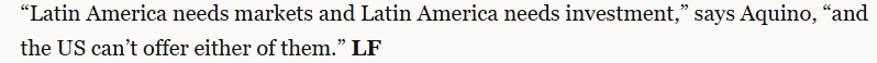 文章指出,并非所有人都對(duì)拉美與中國(guó)之間的合作感到滿意。華盛頓尤其擔(dān)心。不過(guò),許多人認(rèn)為華盛頓影響拉丁美洲的能力有限。文章援引利馬國(guó)立圣馬科斯大學(xué)的亞洲經(jīng)濟(jì)專(zhuān)家卡洛斯·阿基諾的話指出,“拉丁美洲需要市場(chǎng)和投資,但美國(guó)無(wú)法提供其中任何一項(xiàng)”。