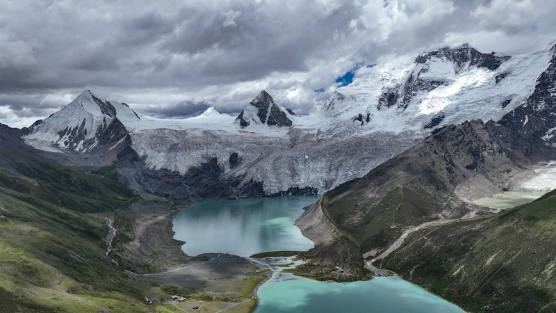 7月19日拍攝的薩普雪山及延伸的冰川(無(wú)人機(jī)照片)。