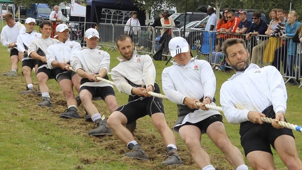 與人們平??吹降摹坝驳匕魏印辈煌肋\會上的拔河比賽是在室外天然草皮上進行,也就是“草地拔河”。比賽實行8人制,像拳擊一樣分不同的重量級,全隊體重一旦“超重”,直接少一人上場。比賽使用的專業(yè)麻繩長達35米,周長12.5厘米,繩上中心點拉過己方4米標(biāo)記線即為獲勝。