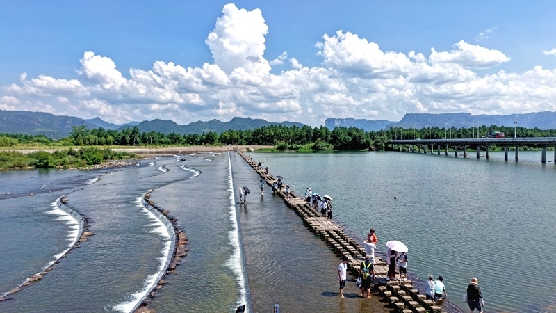 8月11日,游人在浙江省臺州市仙居縣永安溪白塔鎮(zhèn)段游玩(無人機照片)。