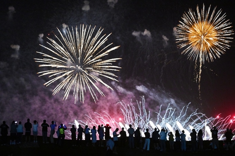8月10日,游客在寧夏中衛(wèi)市沙坡頭區(qū)觀看煙花表演。