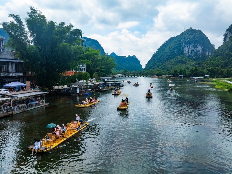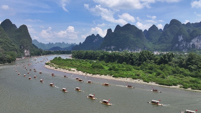 8月10日,在漓江廣西桂林市陽朔縣興坪鎮(zhèn)段,游客乘竹筏游玩賞景(無人機照片)。