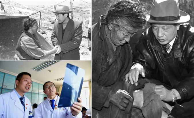 左上圖為來自陜西的援藏干部、阿里日土縣副縣長(zhǎng)賈冗勇深入牧區(qū),幫助藏族牧民解決生產(chǎn)、生活的實(shí)際困難(新華社記者土登攝,1997年11月11日發(fā));左下圖為2017年8月3日,北京積水潭醫(yī)院援藏醫(yī)生龔曉峰(右)和北京天壇醫(yī)院援藏醫(yī)生李家謀在拉薩市人民醫(yī)院骨科病房?jī)?nèi)查看患者的X光片(新華社記者晉美多吉攝);右圖為孔繁森(右)在阿里日土縣過巴鄉(xiāng)為孤寡老人益西卓瑪治?。ㄐ氯A社記者土登攝,1994年12月26日發(fā))。