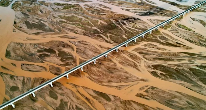 青藏鐵路跨過沱沱河的辮狀河道(2023年7月26日攝,無人機(jī)照片)。新華社記者 劉詩平 攝
