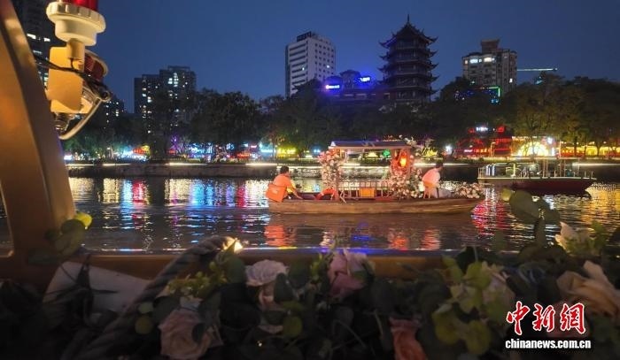 中新社成都9月2日電 (賀劭清 陶思閱)“本是為了大熊貓而來,卻被眼前這條河吸引,一時分不清今夕何夕,是在船上還是在畫中?!?月1日晚,馬來西亞游客林雪萍與家人泛舟成都錦江,在現(xiàn)代與歷史交織的蜿蜒河道間,一船覽盡錦江花月。