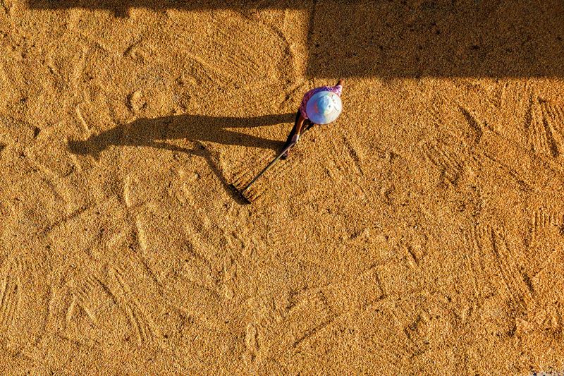 9月2日,山東省臨沂市平邑縣臨澗鎮(zhèn)農(nóng)民在晾曬收獲的玉米(無人機照片)。