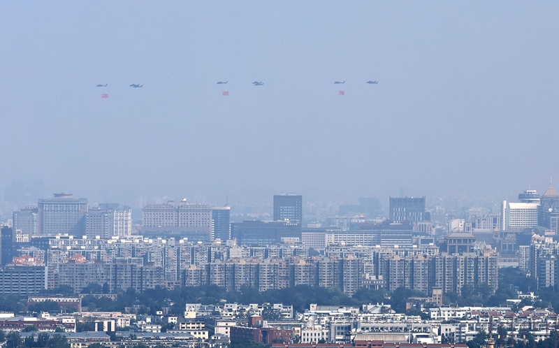 9月3日,紀(jì)念中國人民抗日戰(zhàn)爭暨世界反法西斯戰(zhàn)爭勝利80周年大會在北京隆重舉行。這是空中護(hù)旗梯隊(duì)飛過天安門廣場上空,26架直升機(jī)匯成巨大的“80”字樣。