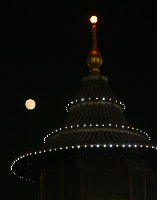 10月6日,一輪圓月與江蘇省揚州市文昌閣的燈光相映成趣。