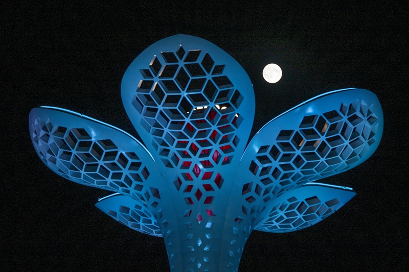 10月6日,人們在黑龍江省佳木斯市富錦萬畝水稻公園賞月。