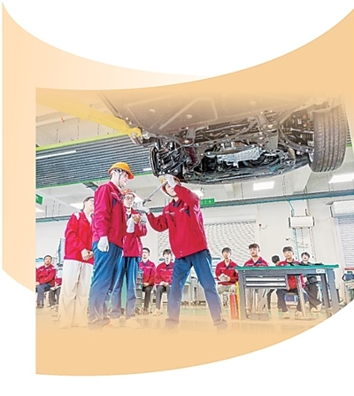 山東水利技師學院實訓中心,學生正進行整車維修和保養(yǎng)操作。
