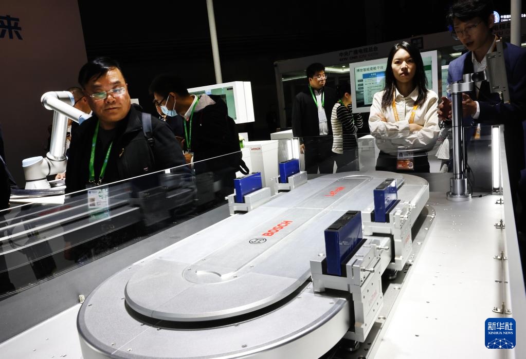 11月6日,參觀者在博世公司展臺展出的LeTrak磁驅傳輸系統(tǒng)展品旁駐足觀看,這是該產品的全球首發(fā)。