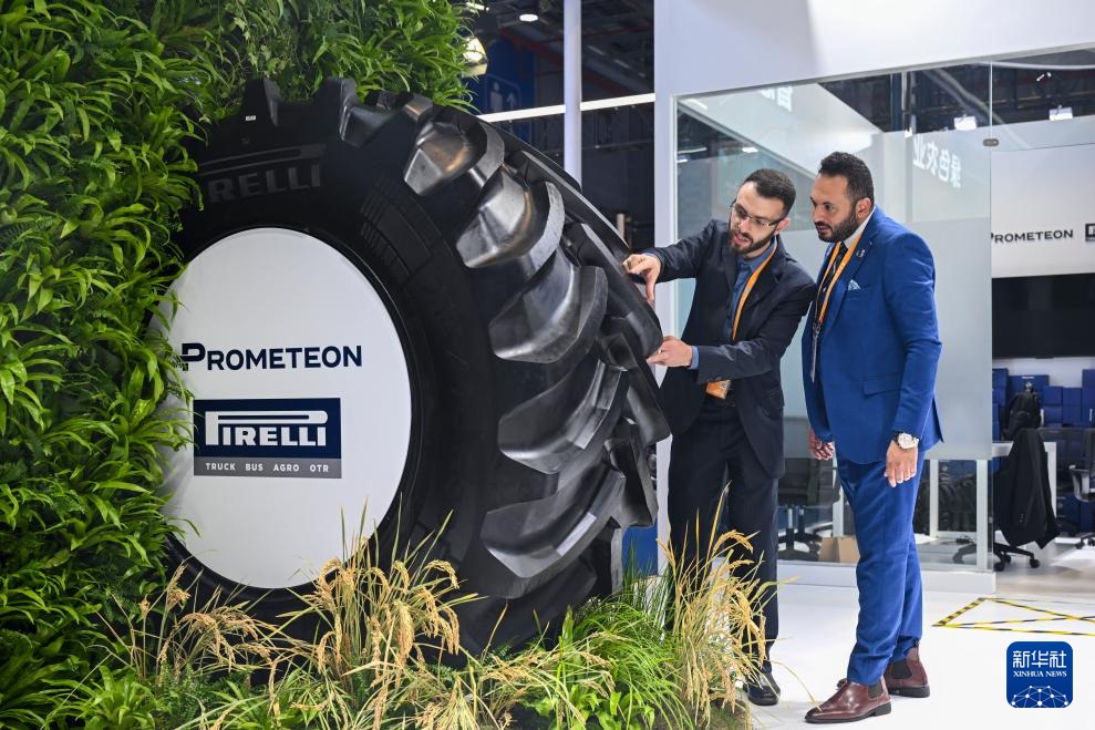 11月6日,在進博會汽車及智慧出行展區(qū)百得安輪胎集團展臺,展商在亞洲首發(fā)產品綠色農業(yè)輪胎AT02前交流。