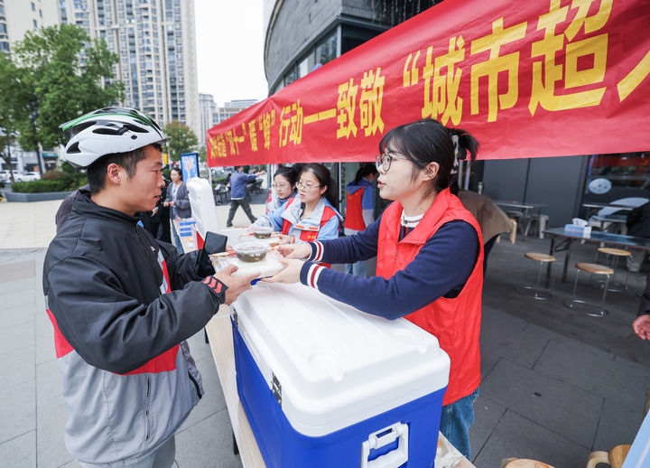 在浙江省諸暨市陶朱街道商業(yè)綜合體的暖心關(guān)愛服務點,志愿者給外賣員提供愛心餐(2025年11月7日攝)。新華社記者 徐昱 攝