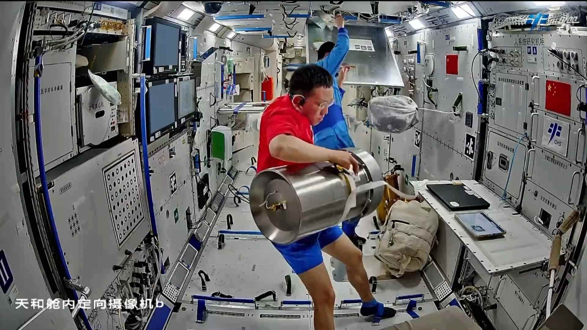 在設備檢查維護方面,乘組開展了低溫存儲裝置及-80℃空間冰箱巡視、環(huán)控氣瓶壓力檢查、再生生保系統(tǒng)設備維護等工作。