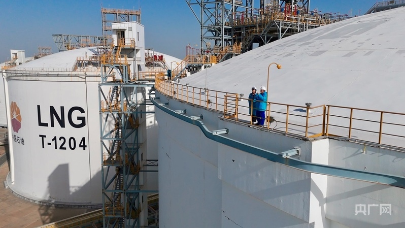 記者和采訪對象站在20萬立方米的LNG儲罐上(央廣網記者 楊夢奎 攝)