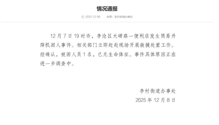 中新網(wǎng)12月8日電 青島李村街道辦事處8日在青島李滄政務(wù)網(wǎng)發(fā)布情況通報稱,12月7日19時許,李滄區(qū)大嶗路一便利店發(fā)生簡易升降機(jī)困人事件。相關(guān)部門立即趕赴現(xiàn)場開展救援處置工作。經(jīng)確認(rèn),被困人員1名,已無生命體征。事件具體原因正在進(jìn)一步調(diào)查中。