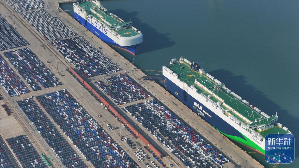↑ 12月15日,國產(chǎn)汽車在山東港口煙臺(tái)港集結(jié)等待裝船出口(無人機(jī)照片)。新華社發(fā)(唐克攝)