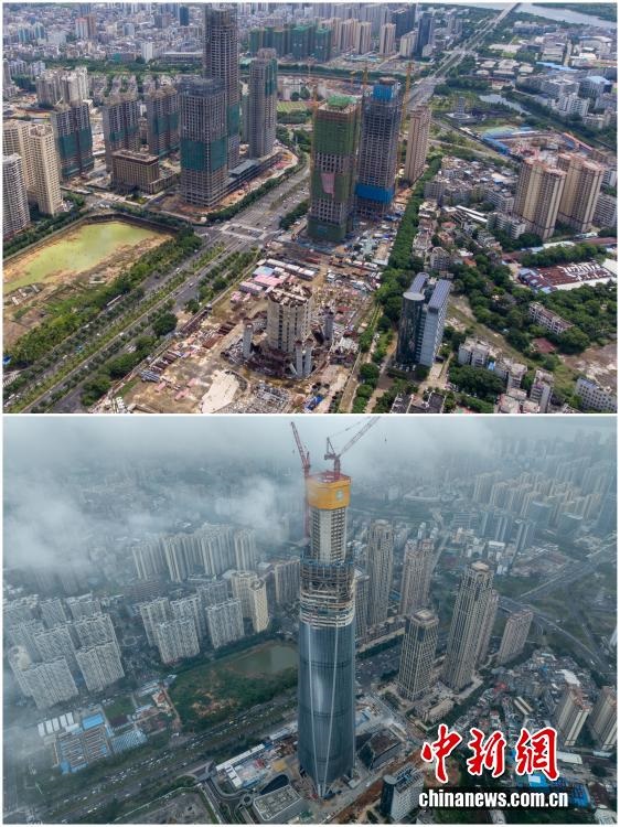 2025年12月18日,海南自由貿(mào)易港正式啟動全島封關。近年來,海南自貿(mào)港建設在利好政策帶動下不斷刷新“自貿(mào)港速度”,一個個重大項目、重點園區(qū)拔地而起,直觀呈現(xiàn)海南自貿(mào)港的蓬勃生機。這里正成為中國對外開放的新前沿、互利合作的新熱土和推動經(jīng)濟全球化的新引擎。上資料圖為2020年8月21日因故停工的“海南第一高樓”海南中心項目,下資料圖為2025年12月16日海南中心項目順利完成塔樓核心筒結(jié)構(gòu)封頂。(拼版圖,無人機照片)