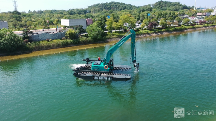 只見(jiàn)一臺(tái)身披“山河綠”的水陸兩棲挖掘機(jī)穩(wěn)穩(wěn)地在水中行駛。駕駛室里的工程師輕拉搖桿,這個(gè)足有兩層樓高的“鋼鐵巨獸”便靈活轉(zhuǎn)身,履帶劃過(guò)水面,泛起層層漣漪——輕巧的身姿完全顛覆了人們對(duì)挖掘機(jī)“只能在地上笨重行走”的固有印象。
