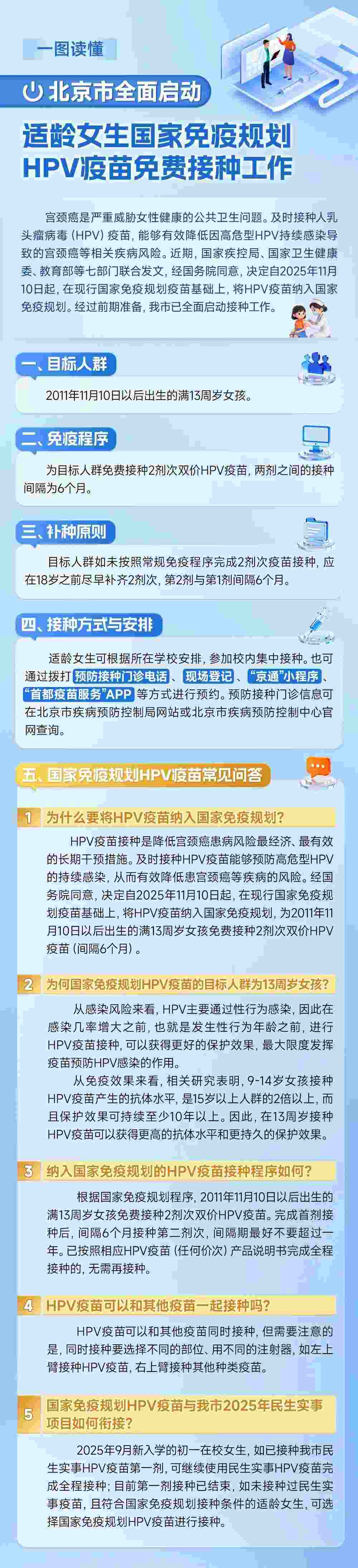 北京市疾控局1月9日介紹,北京已全面啟動(dòng)適齡女生國家免疫規(guī)劃HPV(人乳頭瘤病毒)疫苗免費(fèi)接種工作。