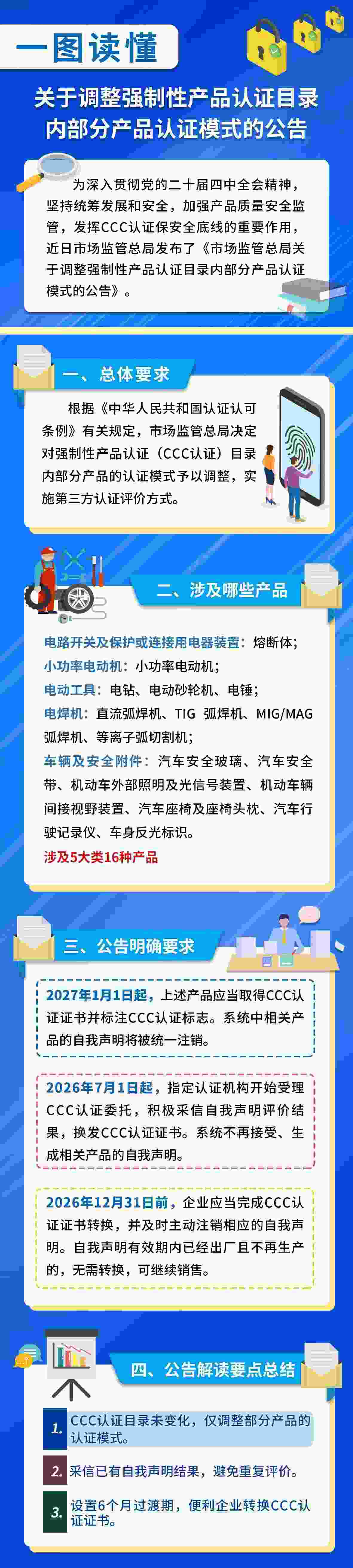 《公告》要求,2027年1月1日起,相關(guān)產(chǎn)品應(yīng)當(dāng)取得CCC認(rèn)證證書并加貼CCC標(biāo)志,方可出廠、銷售、進口或者在其他經(jīng)營活動中使用。2026年7月1日起,指定認(rèn)證機構(gòu)開始受理相關(guān)產(chǎn)品的CCC認(rèn)證委托。