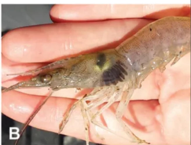 在水質(zhì)差、溶氧低的環(huán)境中,受傷的蝦容易感染細菌或真菌,導致其鰓組織壞死并出現(xiàn)黑色沉積。