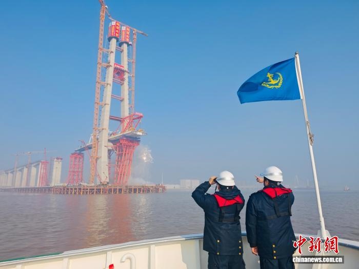 海事部門工作人員現(xiàn)場保障大橋建設(shè)。嘉興海事局供圖