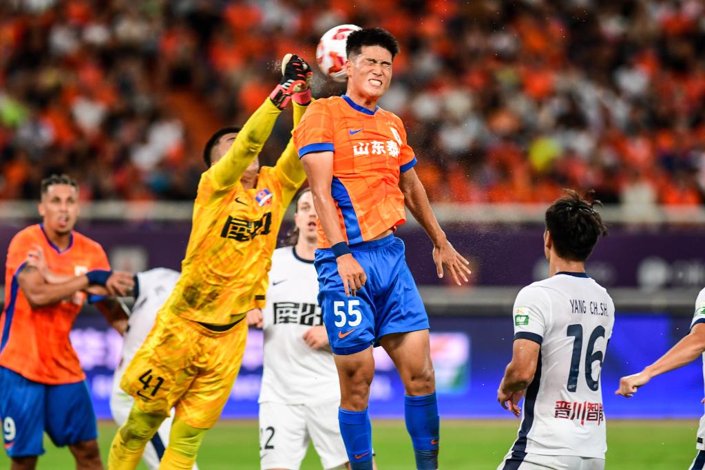 2025年7月27日,山東泰山隊(duì)球員彭嘯(右二)在比賽中爭頂。新華社記者 朱崢 攝
