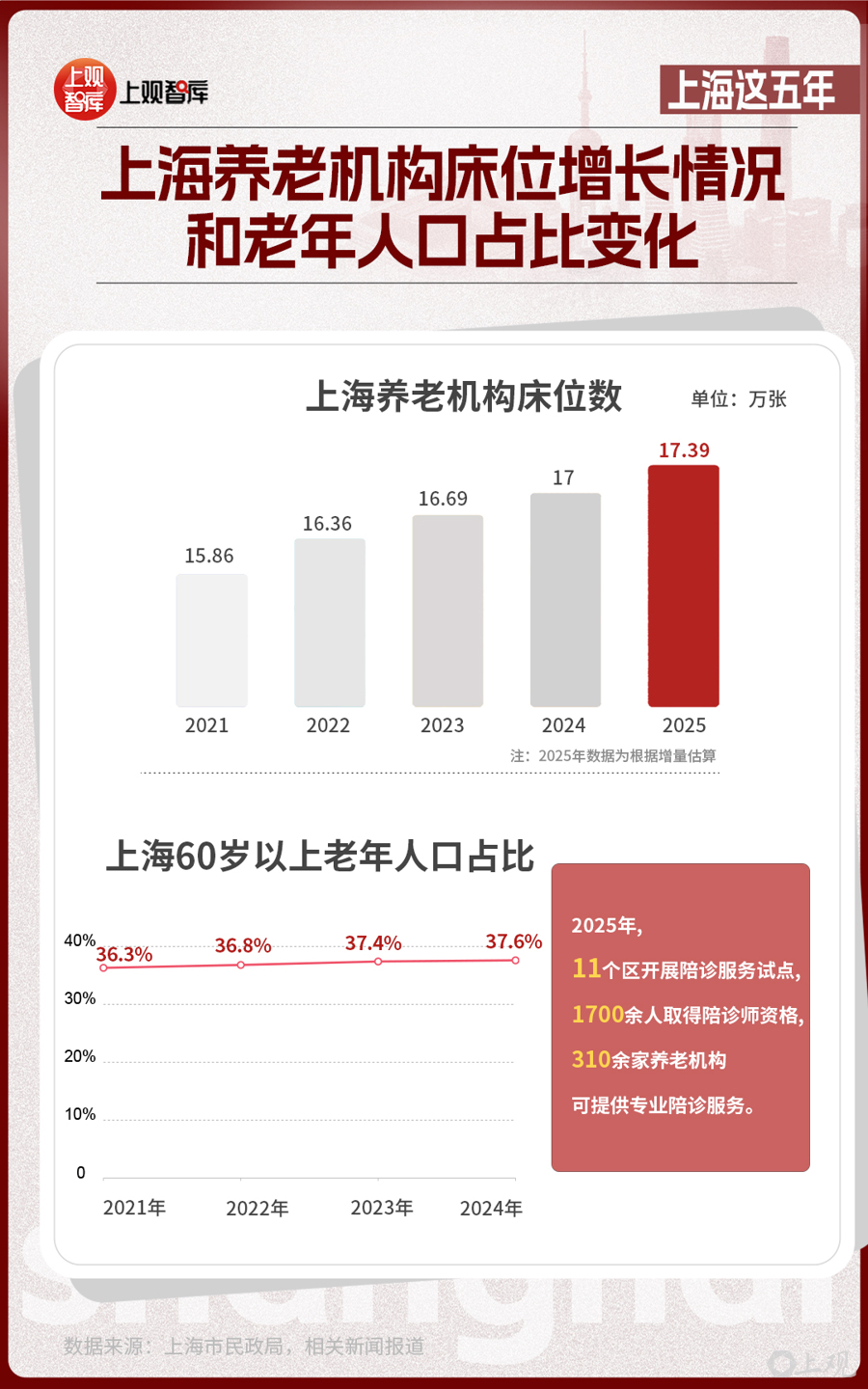 截至2025年3月底,上海市60歲及以上戶籍老年人口達到518.7萬人,占戶籍總?cè)丝诘?6.2%。上海相關(guān)健康指標(biāo)持續(xù)優(yōu)化,人均期望壽命有望超過84歲,保持發(fā)達國家水平。