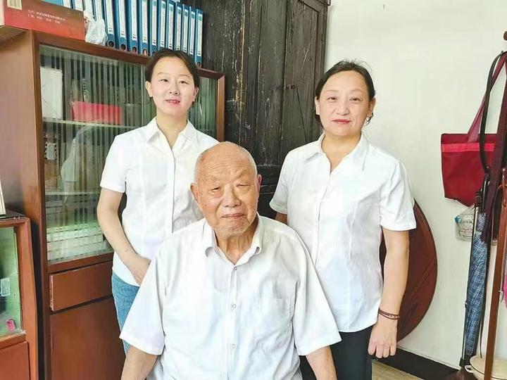 黃岡市級非遺代表性項目“紅色革命歌謠”的代表性傳承人梅仙桃(右)與父親梅基癸、女兒袁曉英合影。(麻城市委宣傳部供圖)