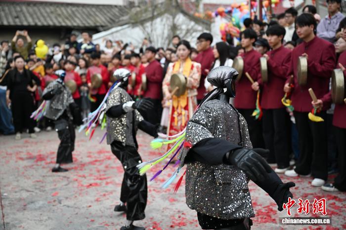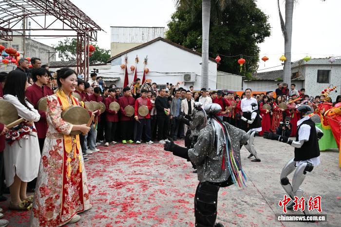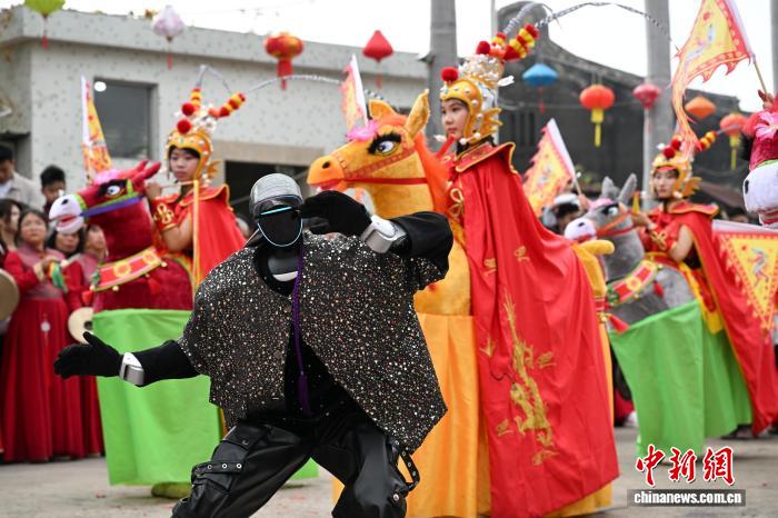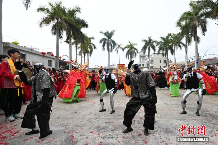 2月24日,廣東省潮州市田頭何村開展民俗巡游活動,機(jī)器人與布馬舞舞者共舞,吸引村民觀看。中新社記者 陳楚紅 攝