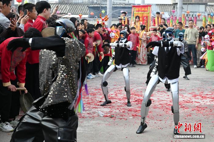 2月24日,廣東省潮州市田頭何村開展民俗巡游活動,機(jī)器人在潮州音樂的伴奏下起舞,吸引村民觀看。中新社記者 陳楚紅 攝