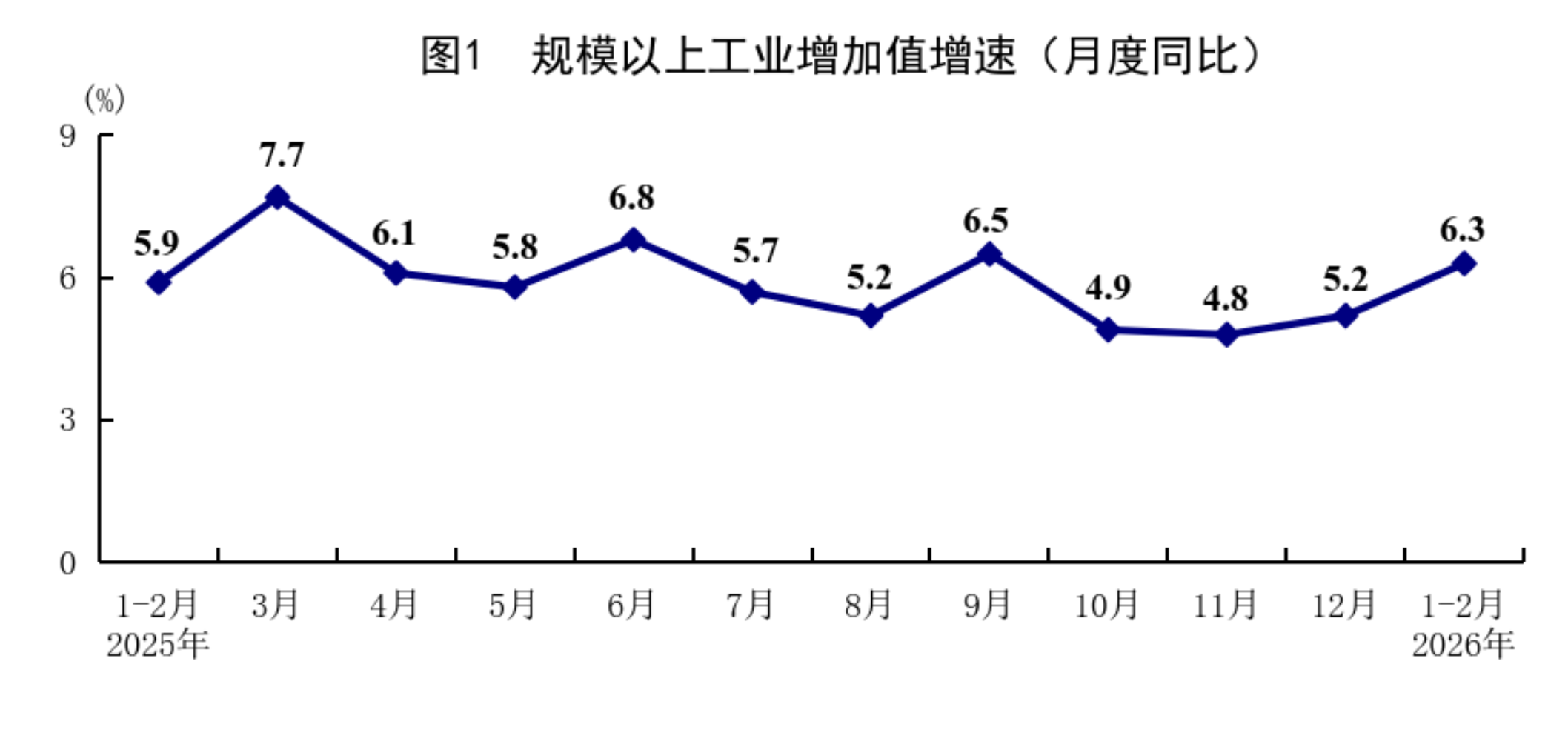 1—2月份,全國規(guī)模以上工業(yè)增加值同比增長6.3%,比上年12月份加快1.1個百分點。分三大門類看,采礦業(yè)增加值同比增長6.1%,制造業(yè)增長6.6%,電力、熱力、燃氣及水生產(chǎn)和供應業(yè)增長4.7%。裝備制造業(yè)增加值同比增長9.3%,高技術制造業(yè)增加值增長13.1%,分別快于全部規(guī)模以上工業(yè)增加值3.0和6.8個百分點。分經(jīng)濟類型看,國有控股企業(yè)增加值同比增長4.2%;股份制企業(yè)增長6.9%,外商及港澳臺投資企業(yè)增長4.0%;私營企業(yè)增長7.4%。分產(chǎn)品看,3D打印設備、鋰離子電池、工業(yè)機器人產(chǎn)品產(chǎn)量同比分別增長54.1%、42.6%、31.1%。從環(huán)比看,2月份規(guī)模以上工業(yè)增加值比上月增長0.83%。2月份,制造業(yè)采購經(jīng)理指數(shù)為49.0%;企業(yè)生產(chǎn)經(jīng)營活動預期指數(shù)為53.2%,比上月上升0.6個百分點。