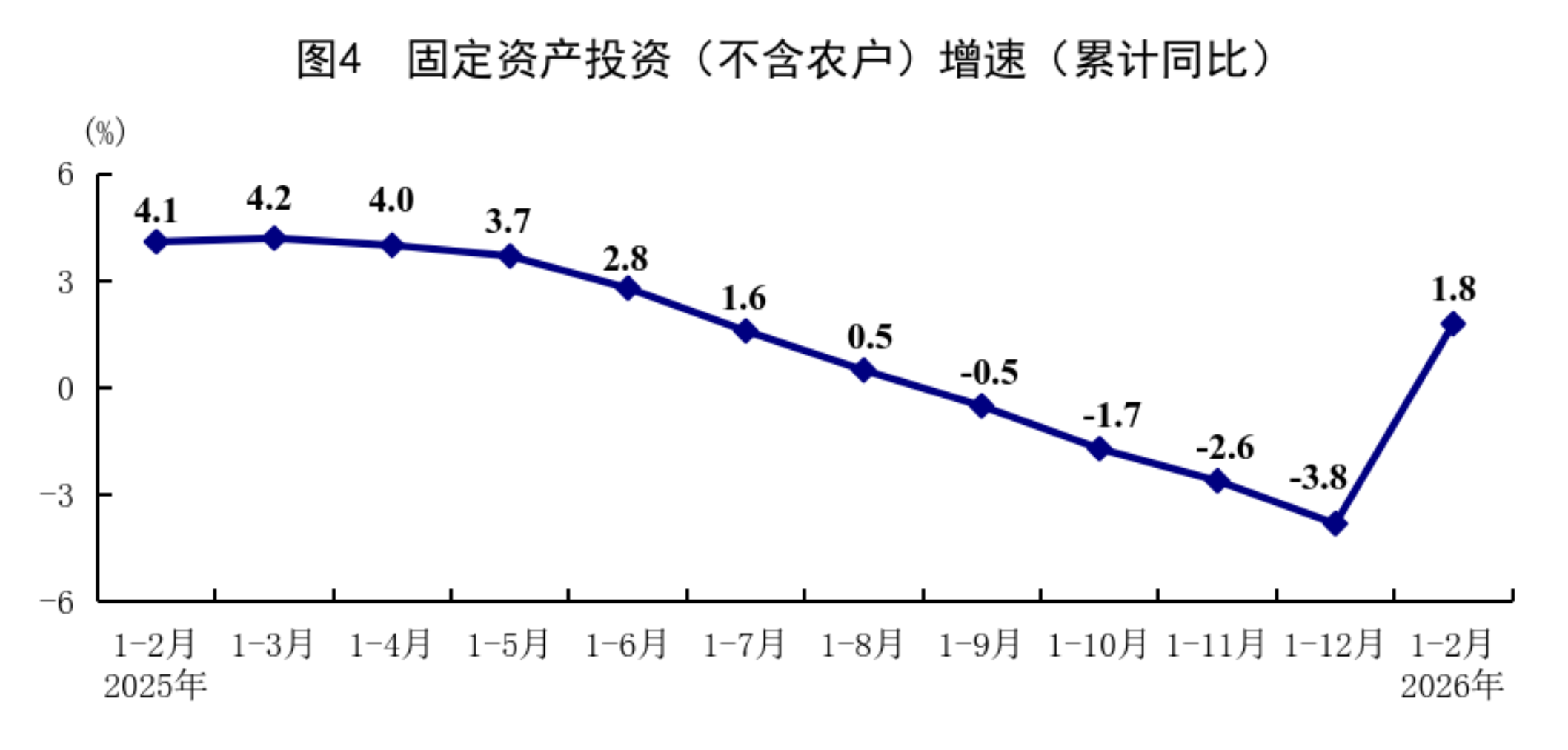 1—2月份,全國固定資產(chǎn)投資(不含農(nóng)戶)52721億元,同比增長1.8%,上年全年為下降3.8%;扣除房地產(chǎn)開發(fā)投資,全國固定資產(chǎn)投資增長5.2%。分領域看,基礎設施投資同比增長11.4%,制造業(yè)投資增長3.1%,房地產(chǎn)開發(fā)投資下降11.1%。全國新建商品房銷售面積9293萬平方米,同比下降13.5%;新建商品房銷售額8186億元,下降20.2%。分產(chǎn)業(yè)看,第一產(chǎn)業(yè)投資同比增長17.4%,第二產(chǎn)業(yè)投資增長5.4%,第三產(chǎn)業(yè)投資下降0.4%。民間投資同比下降2.6%,降幅比上年全年收窄3.8個百分點;扣除房地產(chǎn)開發(fā)投資,民間投資增長1.0%。高技術產(chǎn)業(yè)投資同比增長5.1%,其中航空、航天器及設備制造業(yè),研發(fā)與設計服務業(yè),信息服務業(yè)投資分別增長20.2%、20.6%、16.5%。從環(huán)比看,2月份固定資產(chǎn)投資(不含農(nóng)戶)比上月增長0.39%。