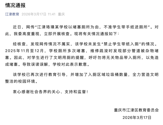 經(jīng)核查,發(fā)現(xiàn)網(wǎng)傳情況不屬實(shí),該學(xué)校未發(fā)生“禁止學(xué)生帶紙入廁”的情況。2025年11月至12月,學(xué)校廁所多次堵塞,維修疏時(shí)發(fā)現(xiàn)部分管道被雜物堵塞。因此,對(duì)學(xué)生進(jìn)行了文明用廁的提醒,呼吁勿將無關(guān)物品帶入廁所,以免造成堵塞。導(dǎo)致誤讀誤解,學(xué)校對(duì)此表示歉意。