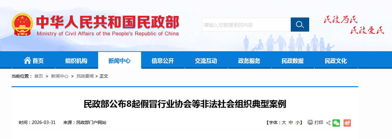 中國網3月31日訊 民政部網站今日公布8起假冒行業(yè)協(xié)會等非法社會組織典型案例,具體如下:
