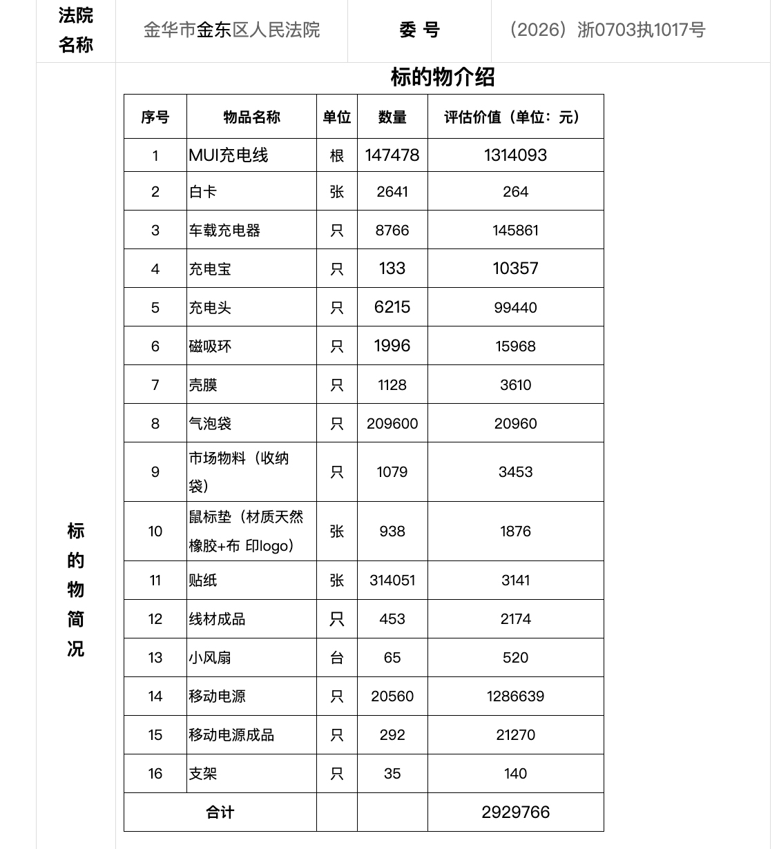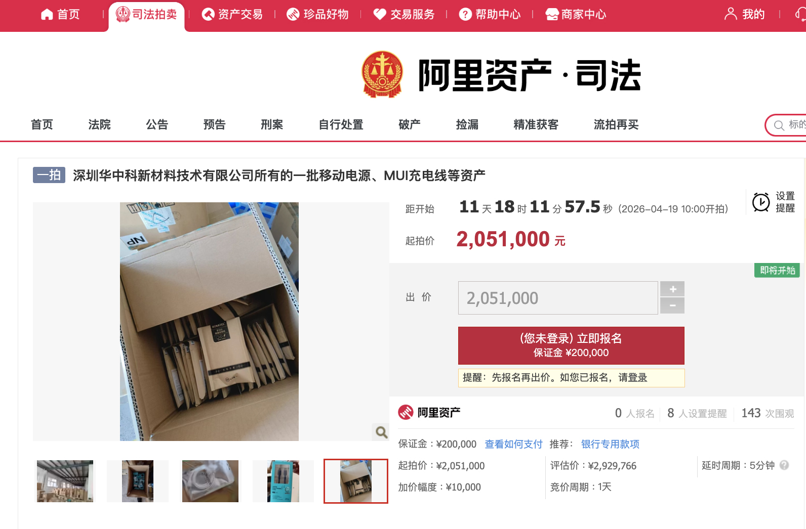 中新網(wǎng)4月7日電(吳家駒)阿里資產(chǎn)·司法平臺(tái)顯示,近日,深圳華中科新材料技術(shù)有限公司所有的一批資產(chǎn)將被司法拍賣(mài),包括:20560只移動(dòng)電源、147478根MUI充電線(xiàn)等,起拍價(jià)205.1萬(wàn)元,評(píng)估價(jià)約292.98萬(wàn)元,拍賣(mài)時(shí)間為4月19日10時(shí)至4月20日10時(shí)。
